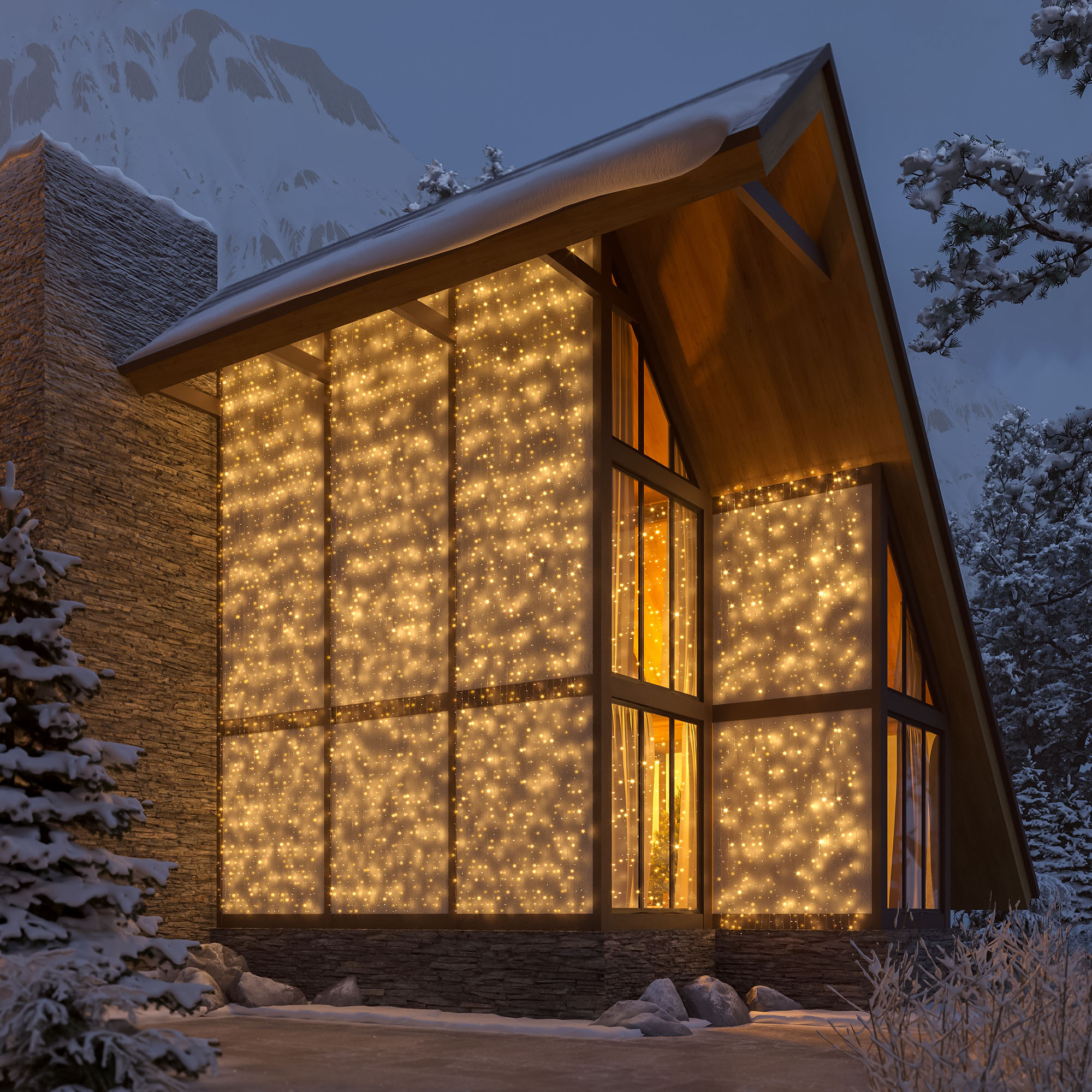 Светодиодный Занавес Classic. Размер 2000x3000 мм (длина 2000 мм, высота 3000 мм). 20 ниспадающих нитей длиной 3000 мм. 760 светодиодов размером 7 мм. Цвет свечения ТЕПЛЫЙ БЕЛЫЙ (3000 К), постоянное свечение и 8 динамических эффектов с резким световым рисунком (прозрачная вогнутая линза). Провод прозрачный, ПВХ. Питание 230 В, Мощность 60 Вт, защита IP65, применение в помещении и на улице под навесом. Аксессуар для подключения и выбора режима свечения в комплекте.
