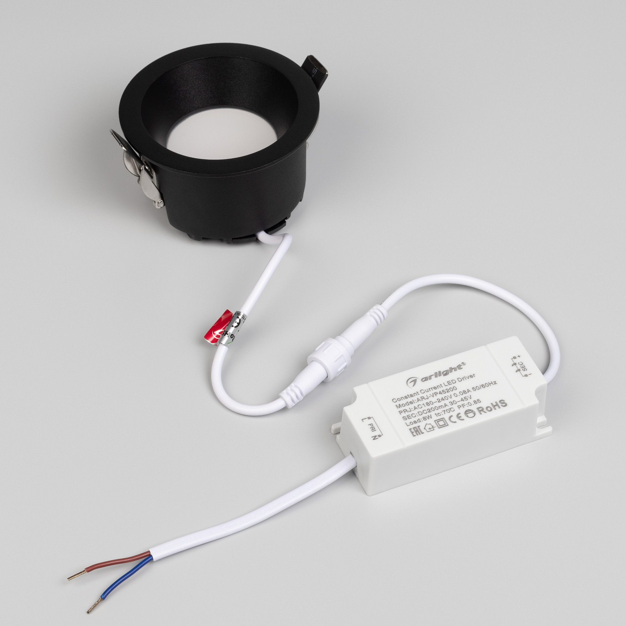 Встраиваемый светильник даунлайт. Мощность 8 Вт, св. поток 660 лм, 82 лм/Вт, дневной 4000 K, CRI>90, угол 85°, напряжение питания 230 В. Чёрный круглый корпус из алюминия, степень защиты IP54. Размер: диаметр 84 мм, высота 49 мм. Монтаж встраиваемый, установочное отверстие: диаметр 75 мм. Драйвер IP54, 30-45 В, 200 мА, пульсация <3%.