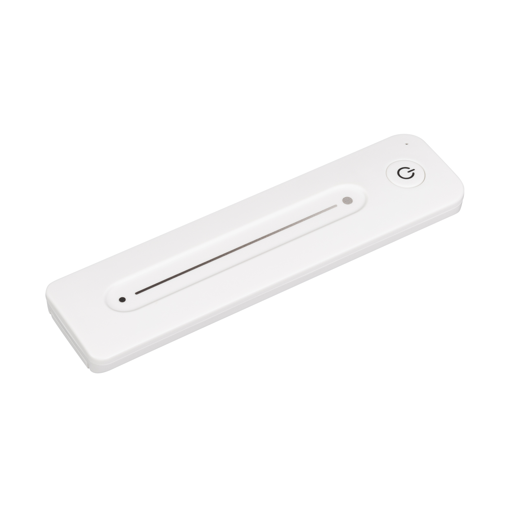 Радиочастотный пульт-слайдер белого цвета, предназначенный для управления одноцветными источниками света. Поддерживает основные функции: включение и выключение света, регулировку яркости, управление 1 световой зоной. Устройство совместимо с диммерами и контроллерами серии SMART, поддерживающими управление по радиоканалу 2.4G. К одному пульту возможно привязать неограниченное количество диммеров и контроллеров. Питание 3В осуществляется от батарейки CR2032. Корпус пульта выполнен из пластика с покрытием Soft-Touch. Габариты устройства 139x36x11 мм.