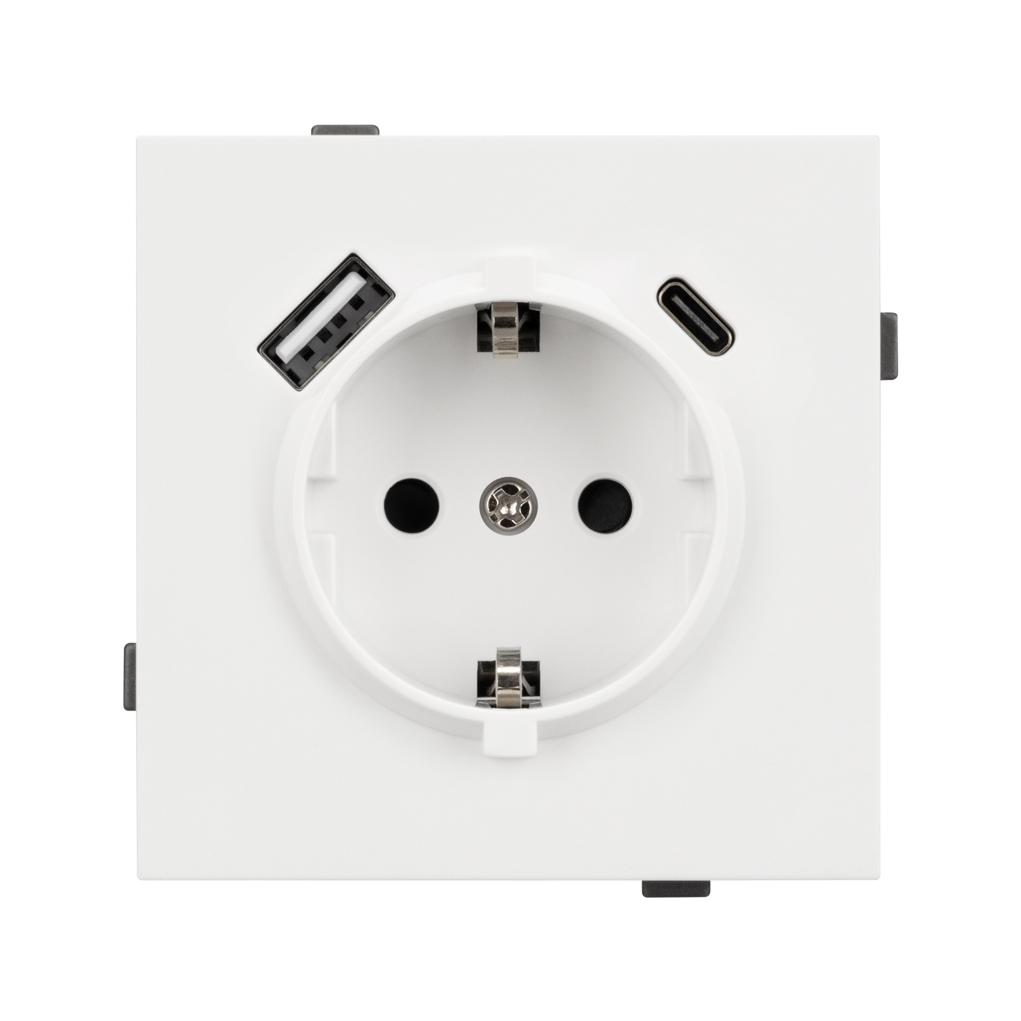 Механизм розетки с заземлением 1 пост 2 USB Type A+C порта. Цвет - белый, с Soft-Touch покрытием. Без фронтальной рамки. Уровень пылевлагозащиты IP20. Розетка устанавливается в стандартный подрозетник круглого сечения диаметром 60мм. Габаритные размеры: длина 71 мм, ширина 71 мм, высота 53 мм. Гарантийный срок 10 лет.