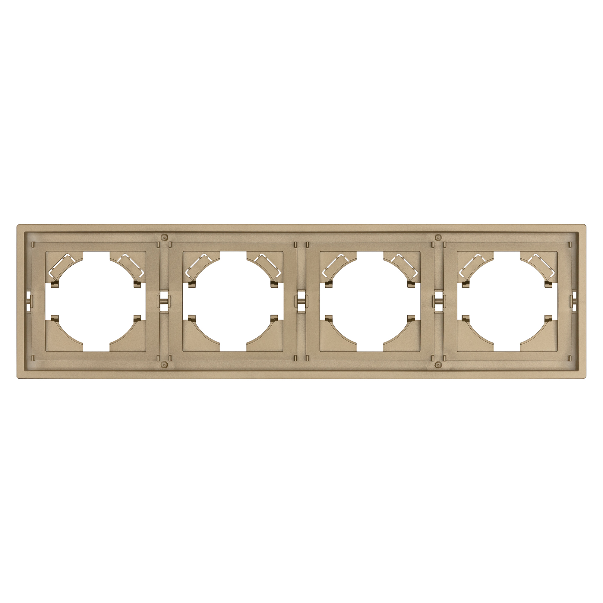 Рамка пластиковая на 4 поста, под встраиваемый механизм. Цвет - золотой, с Soft-Touch покрытием. Среднего уровня герметичности IP20. Ориентация монтажа горизонтальная. Габаритные размеры: длина 294 мм, ширина 80 мм, высота 9 мм. Гарантийный срок 12 мес.