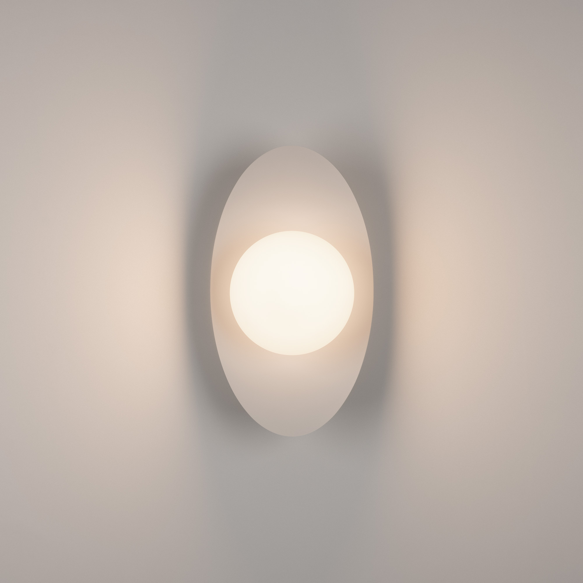 Декоративный настенный светильник. Мощность 6 Вт, св. поток 325-340 лм, 50-52 лм/Вт, теплый 2700 K,теплый 3200К, дневной 4000 K (переключаются) CRI>92, угол 150°, напряжение питания 230 В. Фигурный корпус из алюминия белого цвета, экран из матового стекла, степень защиты IP20. Размер: габариты световой части: Ø145x70 мм, габариты чаши: Ø110 x 42 мм. Монтаж накладной. Встроенный блок питания: 12В DC, 0,75 А, пульсация <2%. Встроенный диммер TOUCH-DIM.