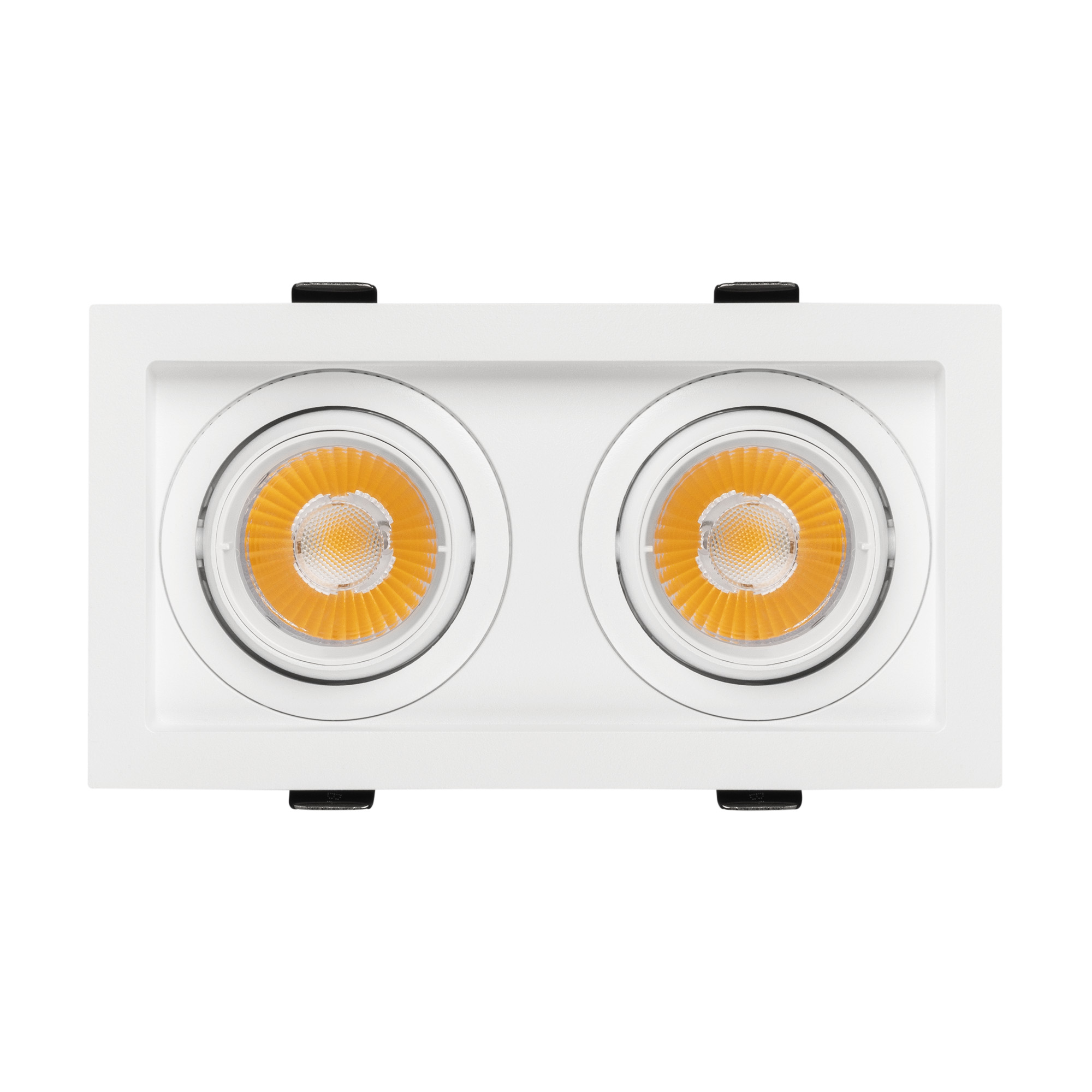 Встраиваемый карданный светильник. Мощность 2х12 Вт, св. поток 2636 лм, 109 лм/Вт, тёплый 3000 K, CRI>92, угол 20°, напряжение питания 230 В. Белый корпус из алюминия, белая вставка, степень защиты IP20. Размер: длина 170 мм, ширина 90 мм, высота 80 мм. Монтаж встраиваемый, установочное отверстие: длина 155 мм, ширина 75 мм. Драйвер 27-40 В, 300 мА, пульсация <2%.