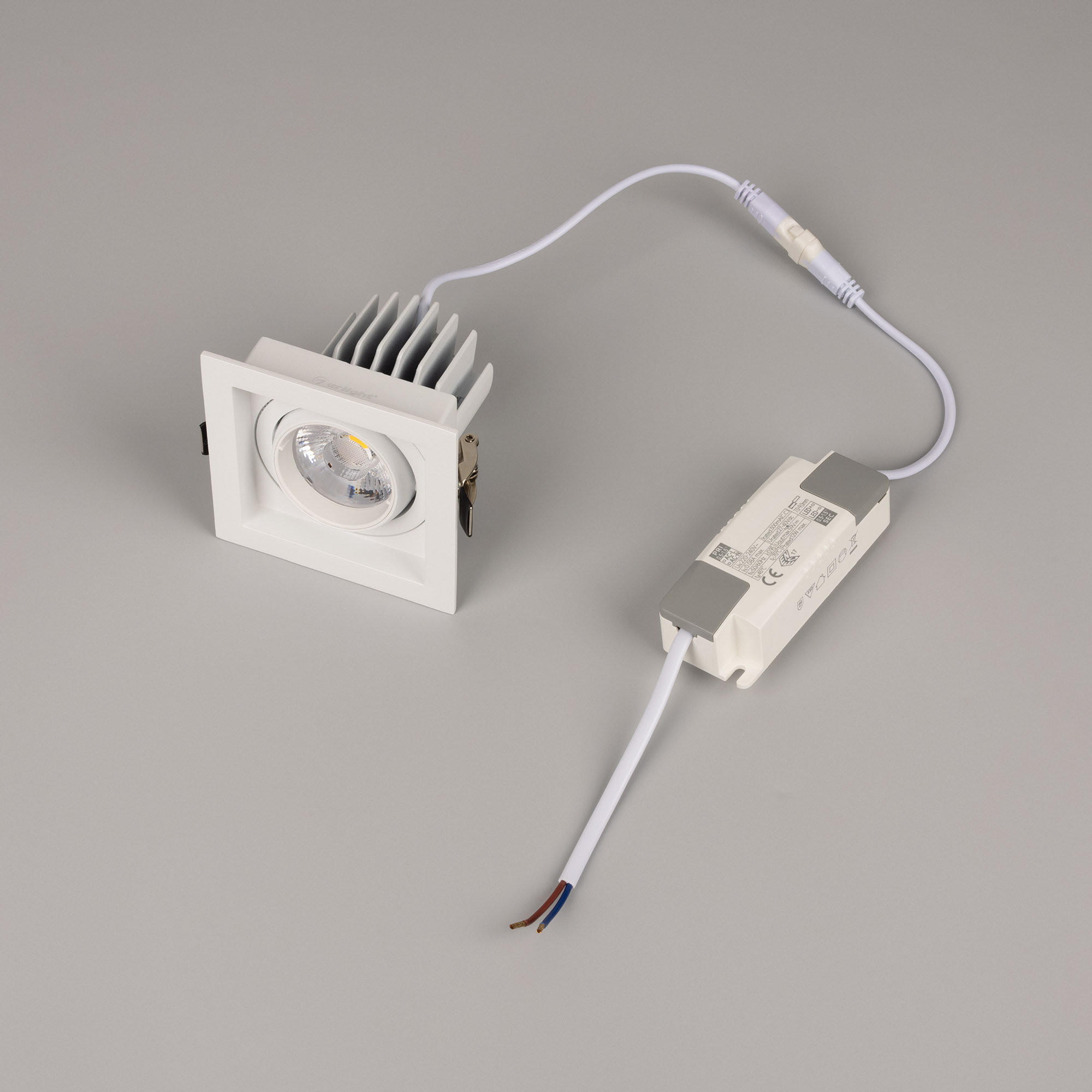 Встраиваемый карданный светильник. Мощность 12 Вт, св. поток 1318 лм, 109 лм/Вт, дневной 4000 K, CRI>92, угол 20°, напряжение питания 230 В. Белый корпус из алюминия, белая вставка, степень защиты IP20. Размер: длина 90 мм, ширина 90 мм, высота 80 мм. Монтаж встраиваемый, установочное отверстие: длина 75 мм, ширина 75 мм. Драйвер 27-40 В, 300 мА, пульсация <2%.