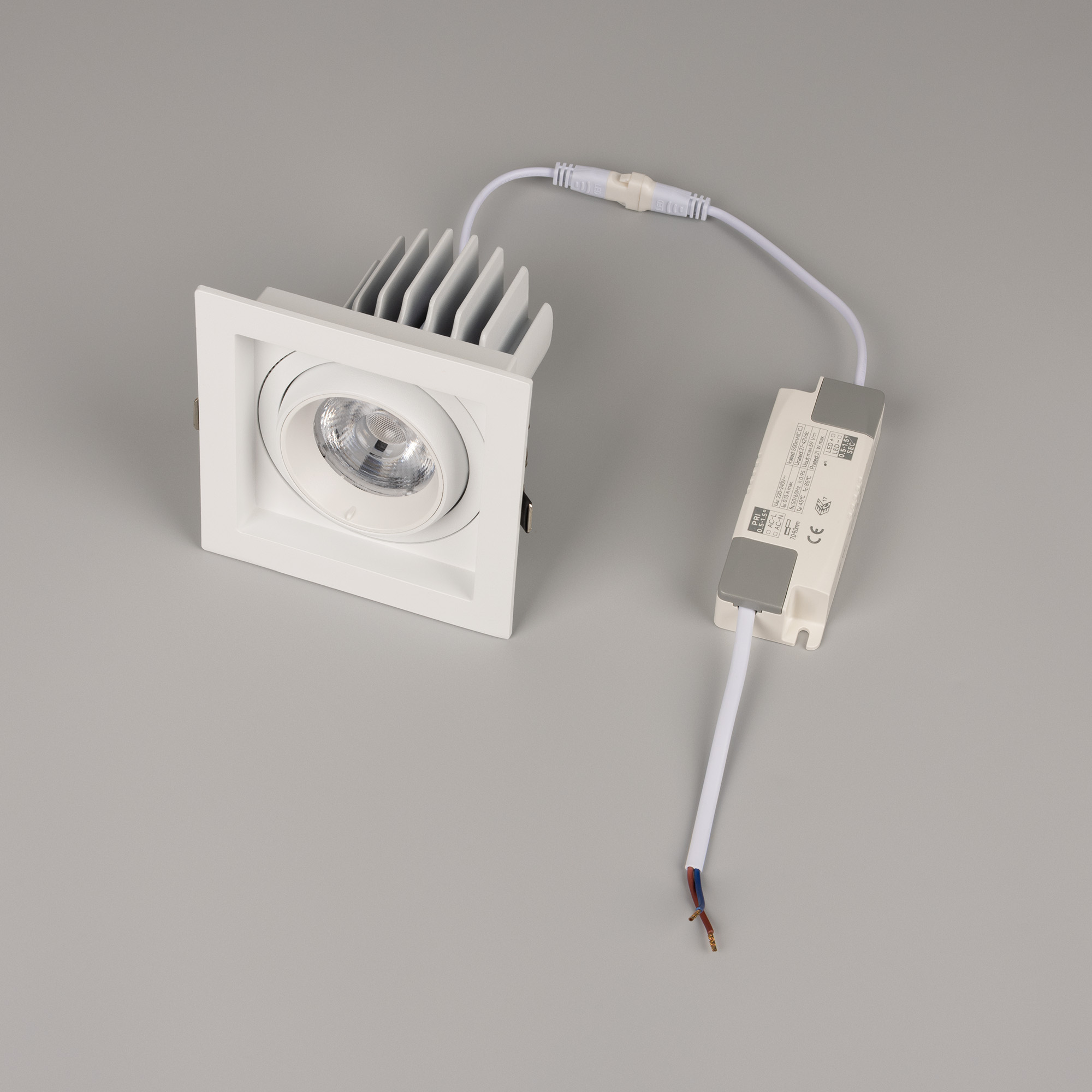Встраиваемый карданный светильник. Мощность 20 Вт, св. поток 2132 лм, 107 лм/Вт, дневной 4000 K, CRI>92, угол 40°, напряжение питания 230 В. Белый корпус из алюминия, белая вставка, степень защиты IP20. Размер: длина 117 мм, ширина 117 мм, высота 105 мм. Монтаж встраиваемый, установочное отверстие: длина 95 мм, ширина 95 мм. Драйвер 24-42 В, 500 мА, пульсация <2%.
