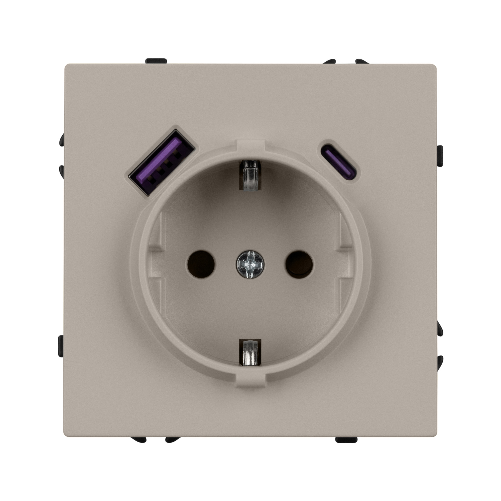 Механизм розетки с заземлением 1 пост и 2 USB Type A+C порта. Цвет - кашемир, с Soft-Touch поверхностью. Без фронтальной рамки. Уровень пылевлагозащиты IP20. Розетка устанавливается в стандартный подрозетник круглого сечения диаметром 60мм. Габаритные размеры: длина 71 мм, ширина 71 мм, высота 53 мм. Гарантийный срок 10 лет.