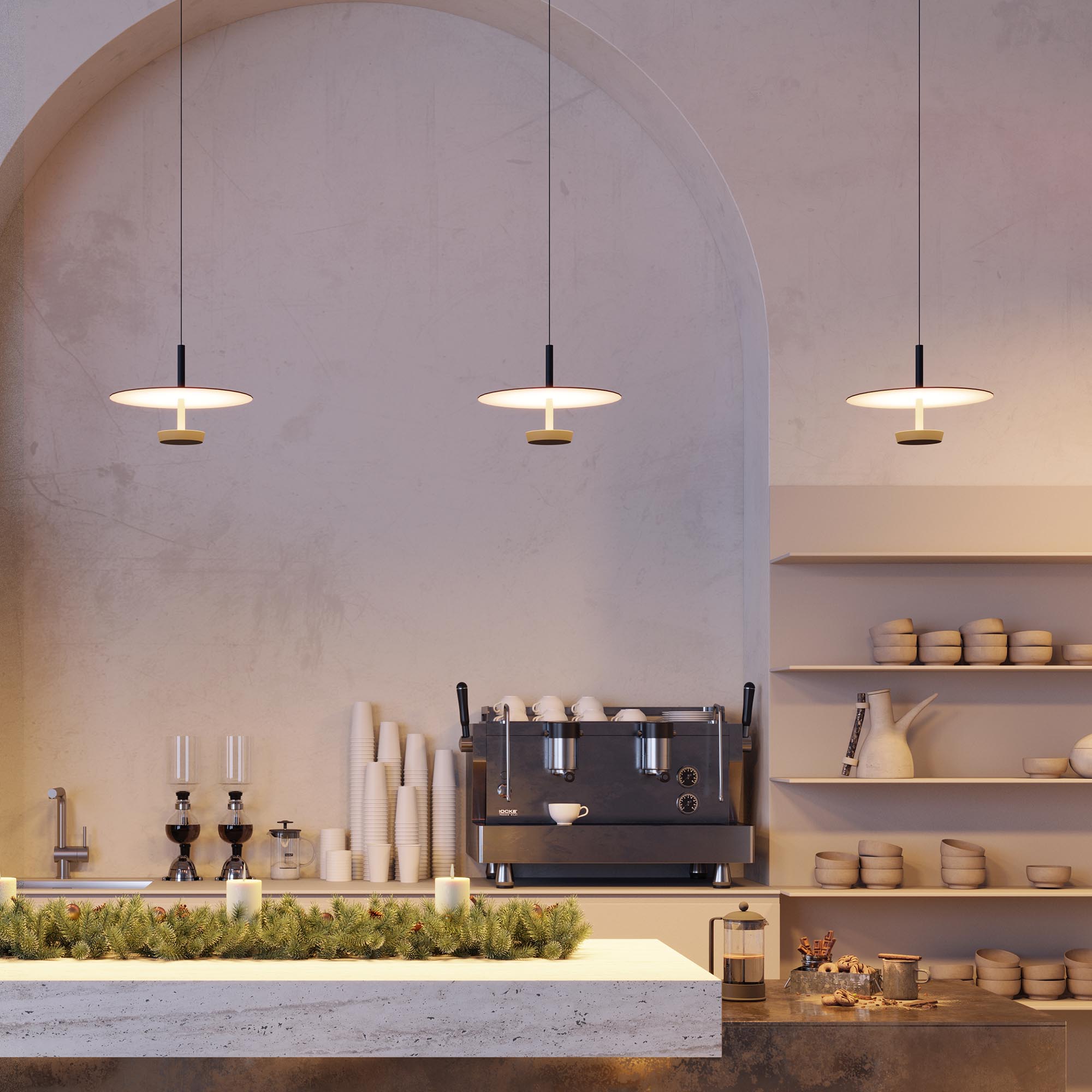 Подвесной светильник. Мощность 9 Вт, св. поток 260 лм, 28 лм/Вт, теплый 3000 K, CRI>94, угол 130°, напряжение питания 230 В. Черный корпус из алюминия, степень защиты IP20. Размер: диаметр плафона 300 мм, высота плафона 203,5 мм. Монтаж подвесной, длина подвеса 1500 мм, регулируемая. Габариты чаши (встраиваемая) Ø70 х 35 мм, врезное отверстие Ø60 мм. Габариты чаши (накладная) Ø100 x 40 мм. Драйвер 26-40 В, 200 мА, пульсация <1%.