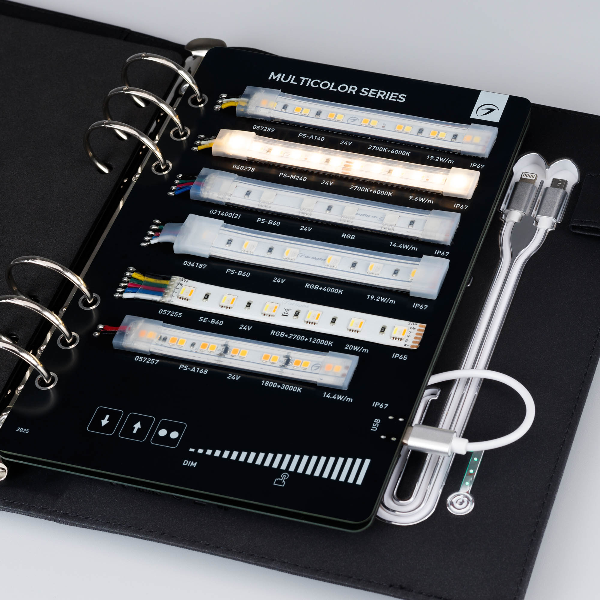 Демонстрационный набор светодиодных лент ARLIGHT. В кейс входят 17 образцов моделей лент COB, RTW, MICROLED, MIX, RGB, (RGBW, RGB-White MIX), NEON (MOONLIGHT). Демо-кейс работает от Power Bank (8000 mAh). в комплекте 3 разъема для подключения и 1 разъем для зарядки.