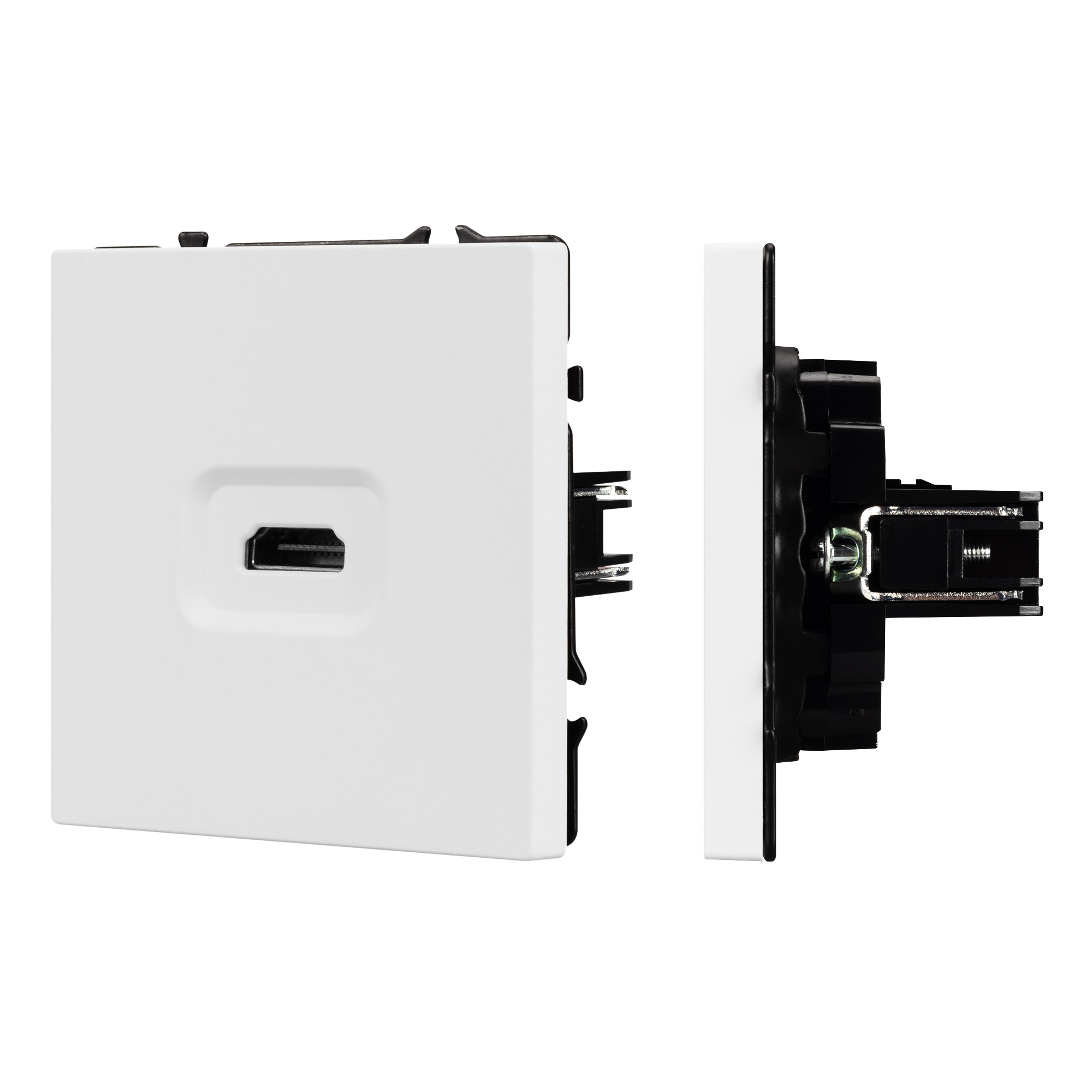 Строгие геометрические линии гармонично сочетаются с функциональностью продуманных механизмов, создавая идеальное решение для дизайн-проектов, где важны как эстетика, так и практичность. Механизм HDMI розетки совместим с рамками серии NOBE, создает утонченный минималистичный вид. Скрытый тип монтажа позволяет гармонично встроить в интерьер любого современного дизайн-проекта. Видимая часть механизма выполнена из высококачественного пластика цвета белый кварц и имеет Soft-Touch покрытие, что придает изделию приятные тактильные ощущения и стильный внешний вид. Выходной порт HDMI (Female). А усиленные распорные лапки двойного захвата надежно фиксируют механизм в установочном подрозетнике круглого сечения диаметром 60мм. Суппорт окрашен в черный матовый цвет под основу механизма и выполнен из металла толщиной 1,5мм, что обеспечивает безопасность и уверенность в установке. На каждой стороне суппорта размещены фиксирующие элементы, позволяющие комбинировать механизмы в системы до 5шт как горизонтально, так и вертикально.