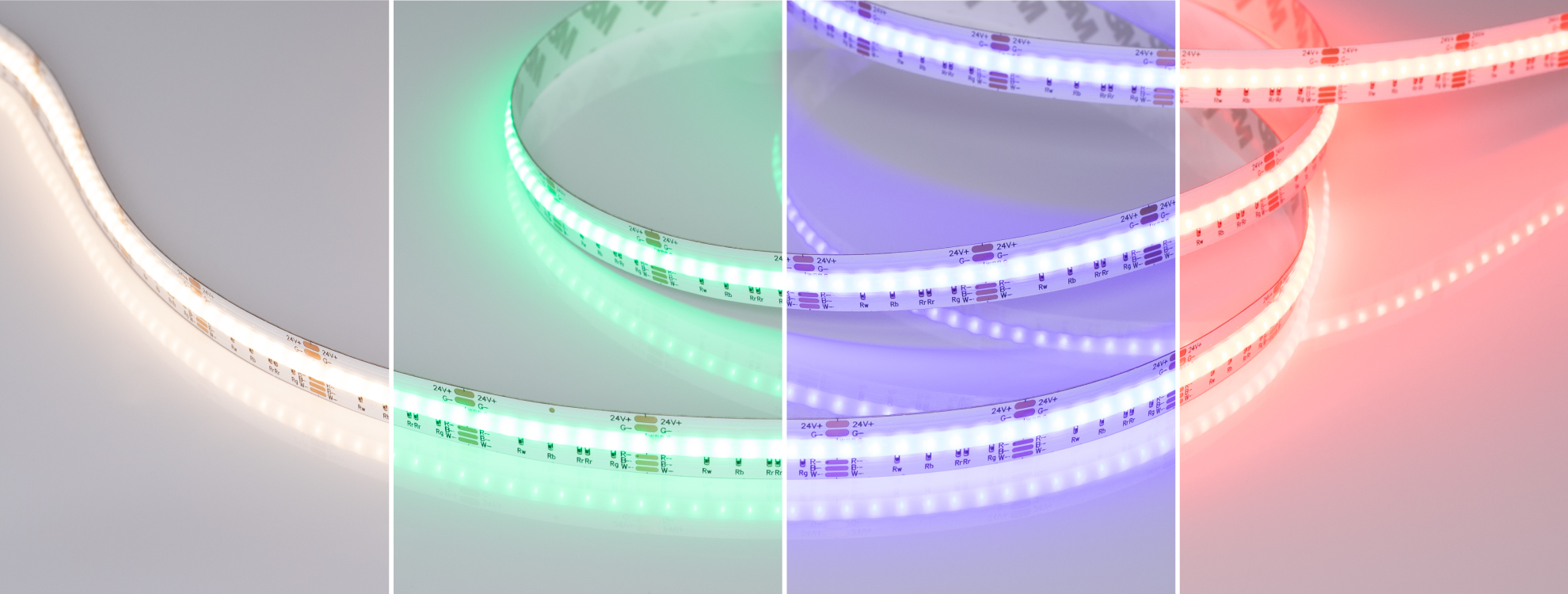 Ленты обладают RGBW-свечением: сочетание белых и RGB-светодиодов позволяет выбрать подходящий оттенок. Свечение белых каналов имеет индекс цветопередачи (CRI>90), который обеспечивает естественное восприятие оттенков в интерьере.