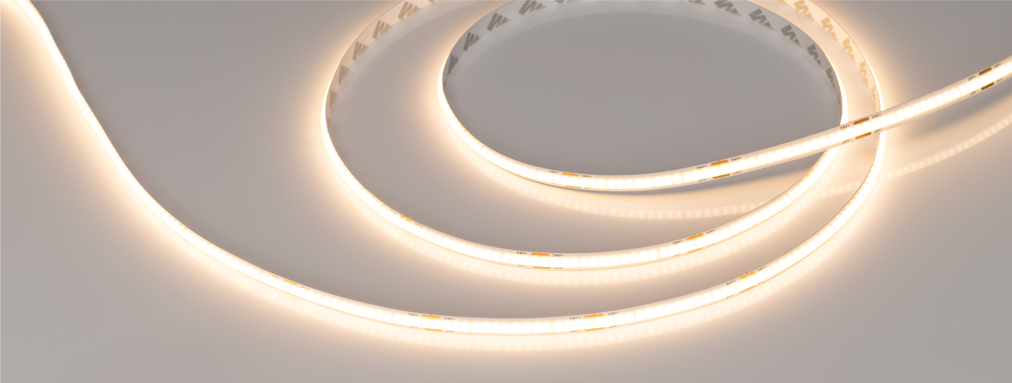 Основное преимущество бескорпусных лент COB — эффект сплошной линии света без применения рассеивателей (экранов). За счет заливки люминофором по всей длине ленты образуется равномерное свечение без видимых точек светодиодов. COB-ленты серии Х320 предназначены для декоративной подсветки интерьера, а также оформления рекламы и витрин. Тип светодиодов — CSP (X).