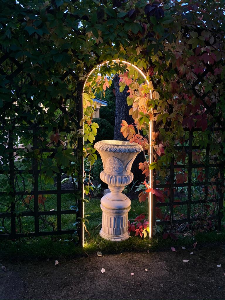 Для оформления фасада дома, а также подсветки декоративной арки в саду была применена герметичная лента со сплошным излучением по всей длине. Такое решение, несмотря на свою предельную простоту, смотрится дорого и эффектно.