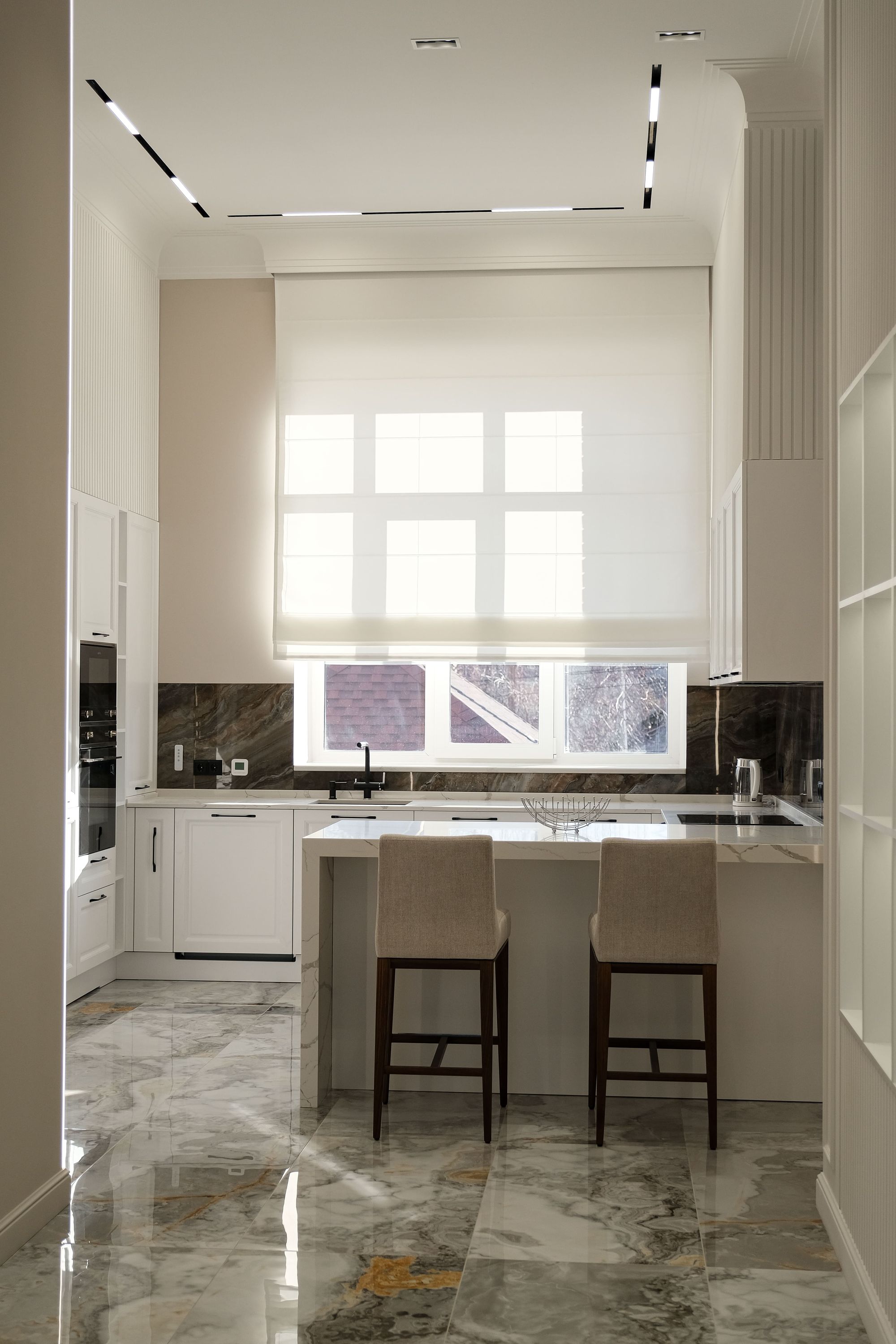 В интерьере частного коттеджа преобладает стиль неоклассицизм. Изящный молдинг, декоративные люстры, обилие мрамора и золотистые элементы фурнитуры грамотно интегрированы в пространство, благодаря чему в коттедже царит ощущение сдержанной роскоши. Однако интерьер остается современным и функциональным, что отчетливо прослеживается в подборе источников освещения.