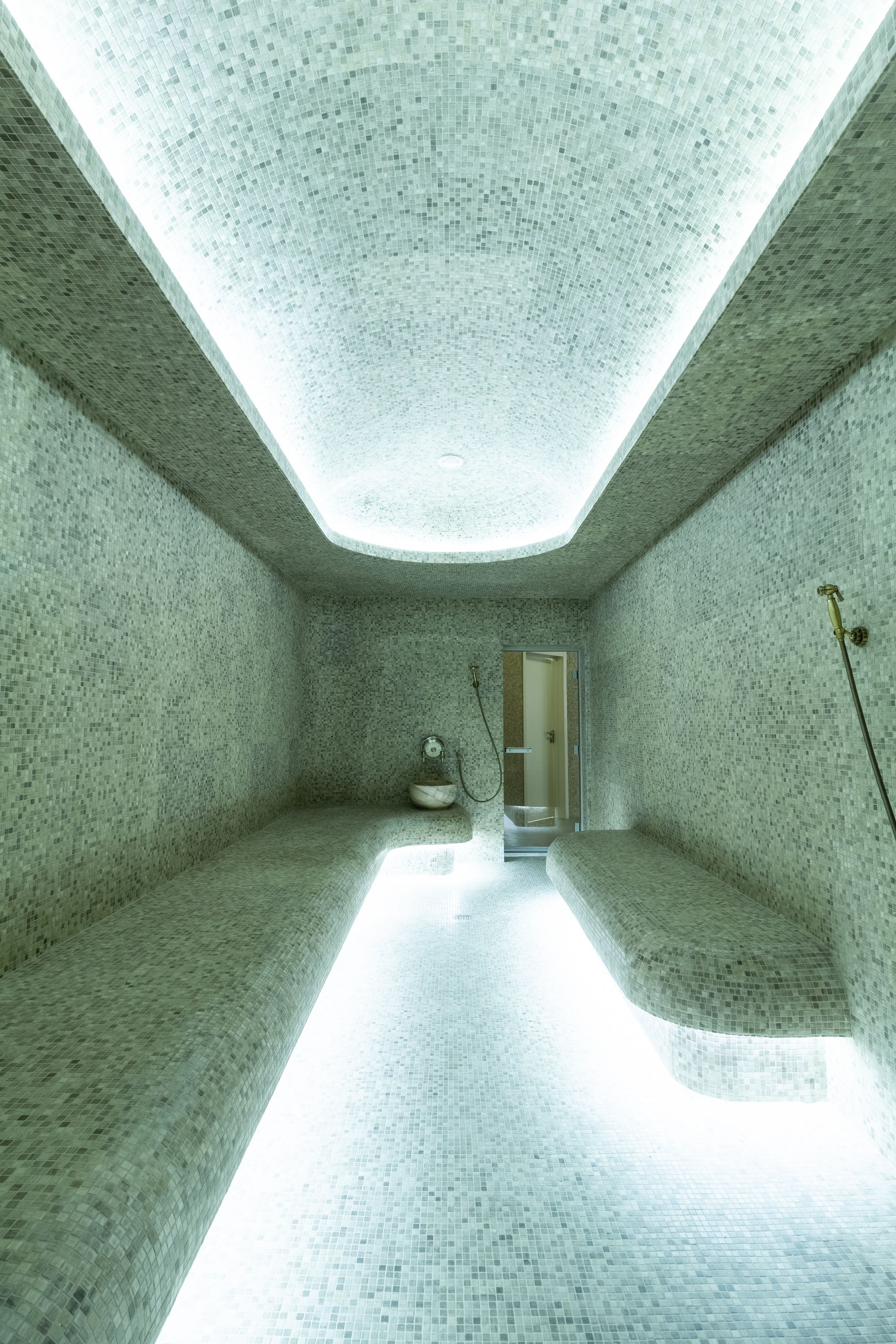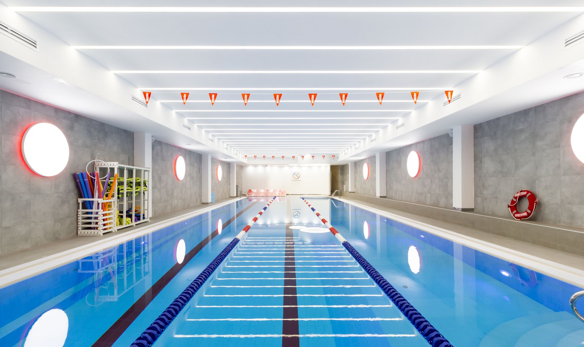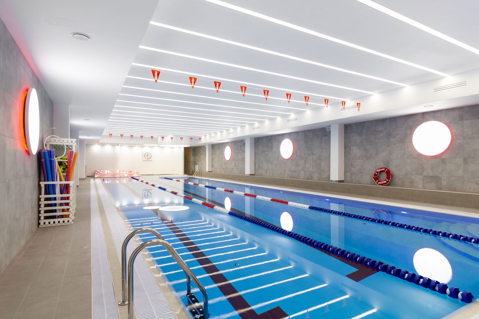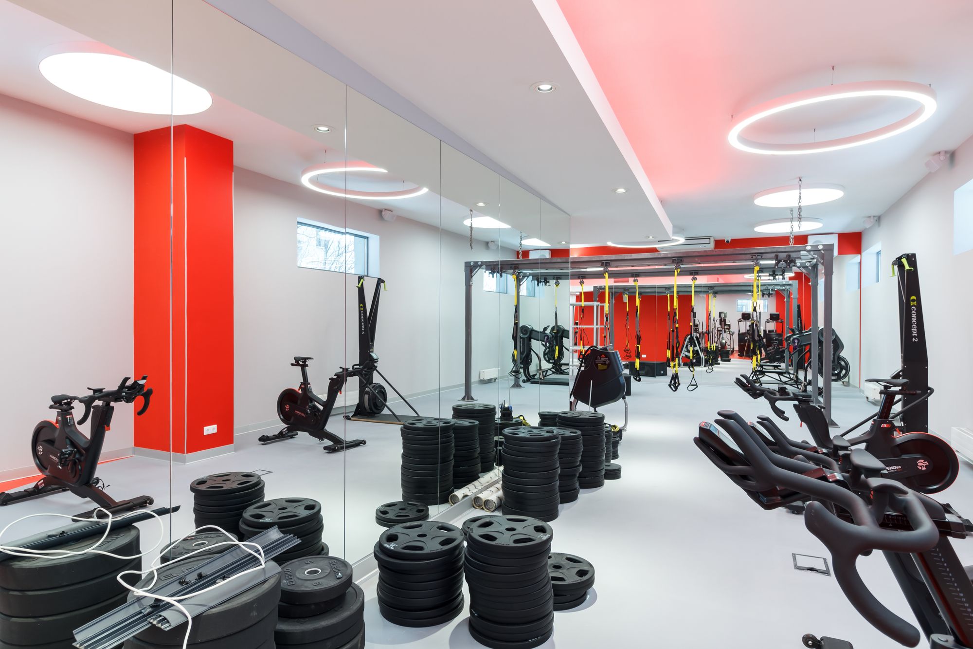 Основное освещение тренажерного зала выполнено с использованием круглых световых конструкций под потолком. Потолочные светильники выглядят как уточненные дизайнерские объекты. В зоне ресепшен размещен большой потолочный светильник, напоминающий мансардное окно, сквозь которое в помещение проникает солнечный свет. Двухрядные ленты с увеличенным числом светодиодов позволяют сделать подсветку равномерной, без видимых точек светодиодов.