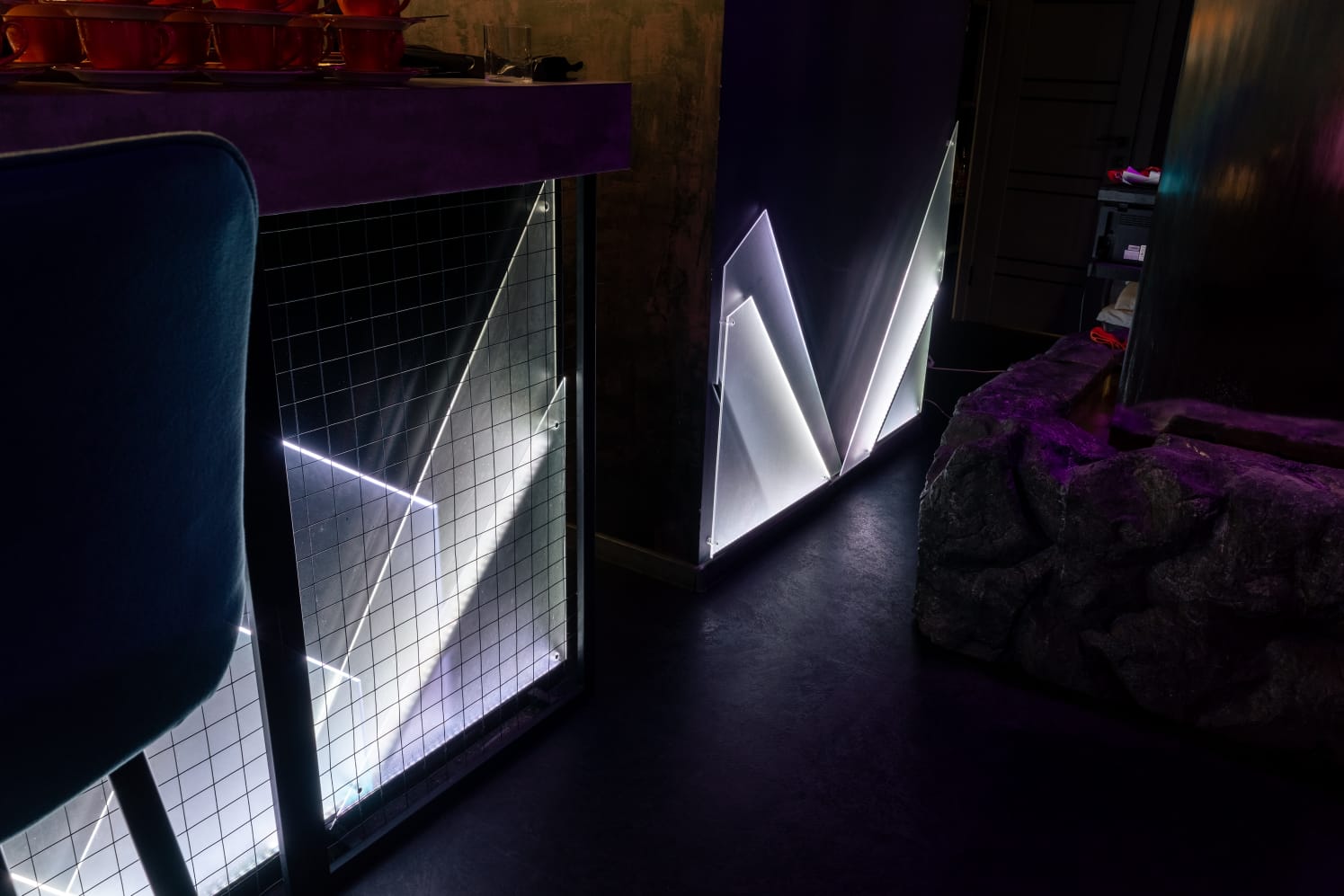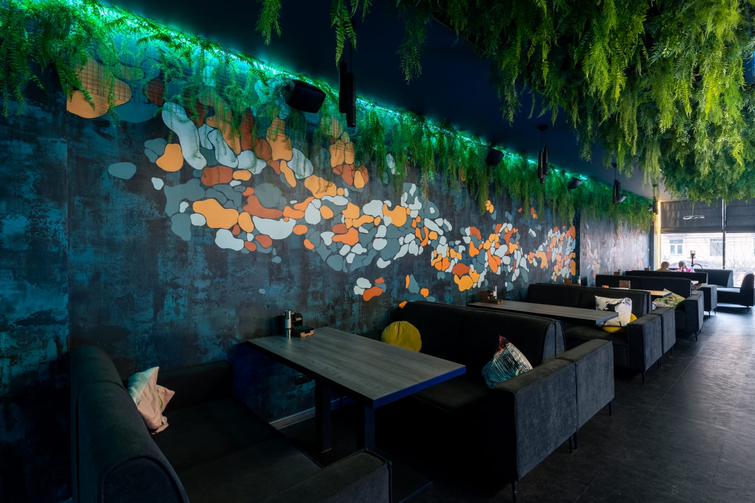 Абстрактные разноцветные пятна на одной из стен создают расслабляющее и легкое настроение. RGB-подсветка обеспечивает дополнительный акцент. Возможность выбора любого цвета свечения позволяет задать в кальянной нужное настроение.
