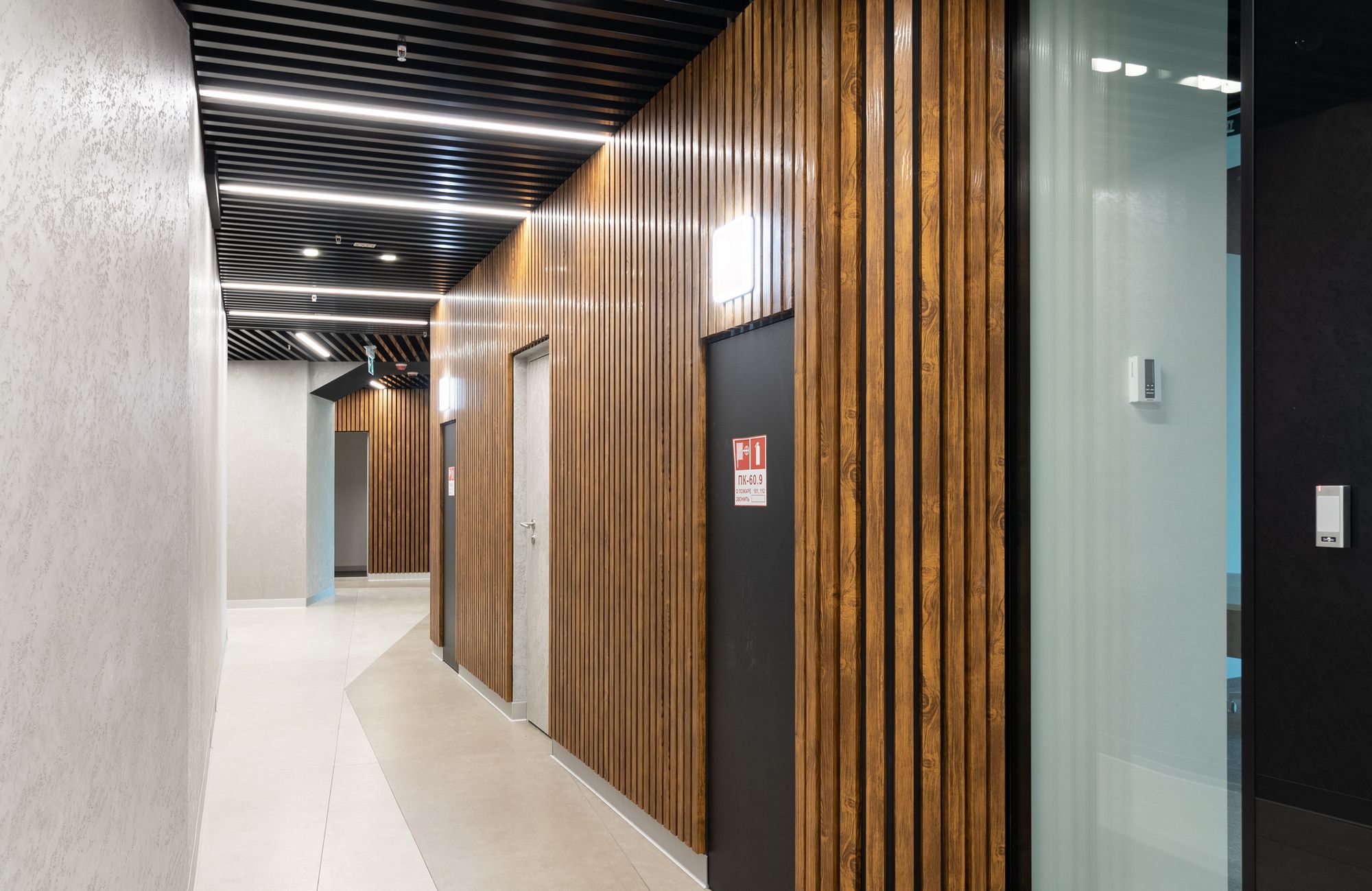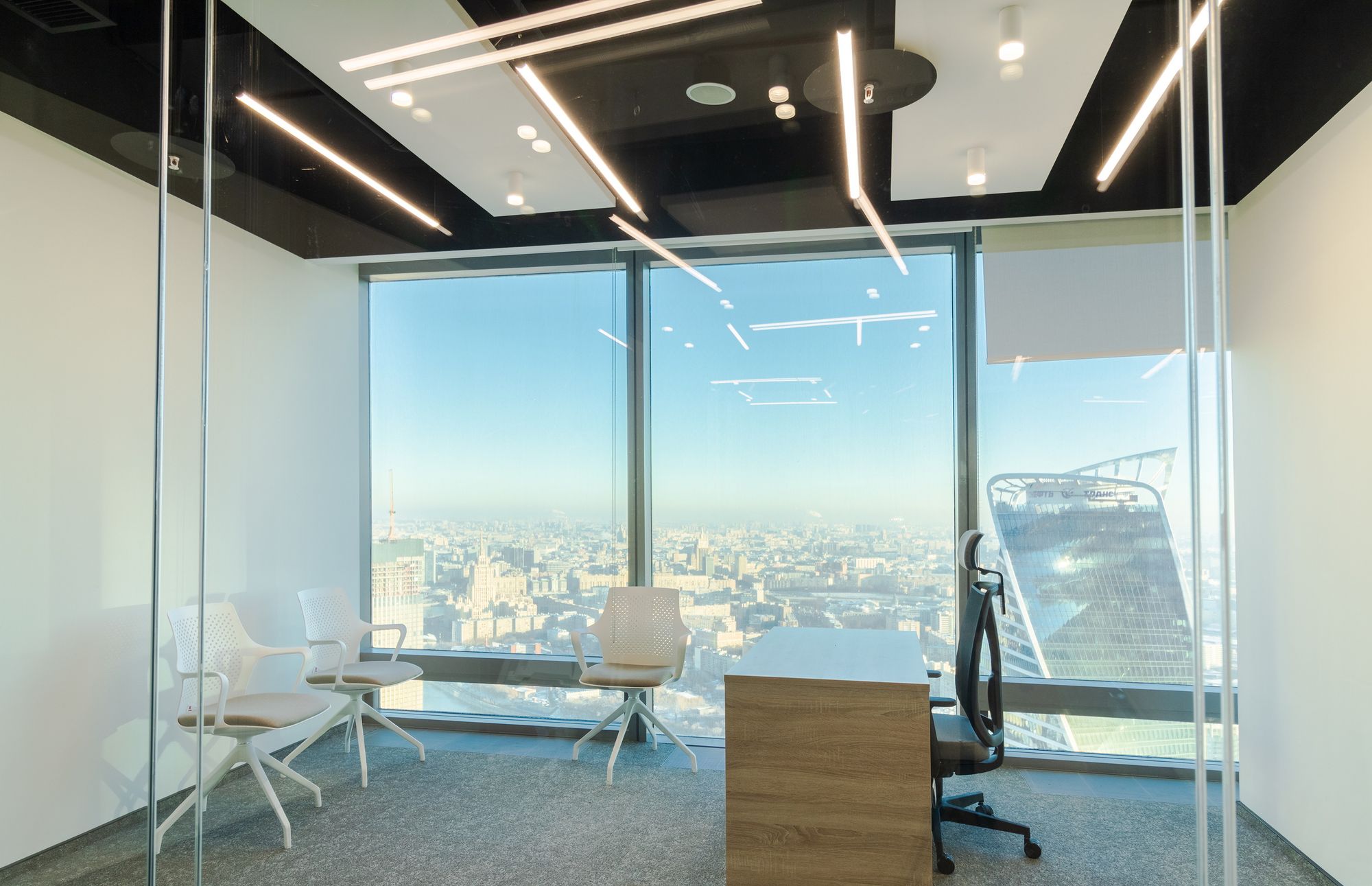 Современный офис с панорамным видом на Москву превратился в уникальное световое пространство. Основным элементом оформления стали подвесные линейные светильники на тросах, при создании которых использовали профиль круглого сечения с матовым экраном. Подвесные светильники не только создают комфортное основное освещение, но и являются дизайнерскими объектами. Для разных зон офиса выбраны разные оттенки белого: теплый белый располагает к комфортному общению, а дневной настраивает на активную работу в течение всего дня. В коридоре использовали встроенные линии света с лентами на черной плате — они очень эффектно смотрятся в помещениях с темными стенами и не выделяются на их фоне. Стильные и оригинальные светильники в виде колец собраны из профилей и широкой светодиодной ленты. В деревянные перегородки заложили линии света, подчеркнув благородную текстуру натурального дерева.