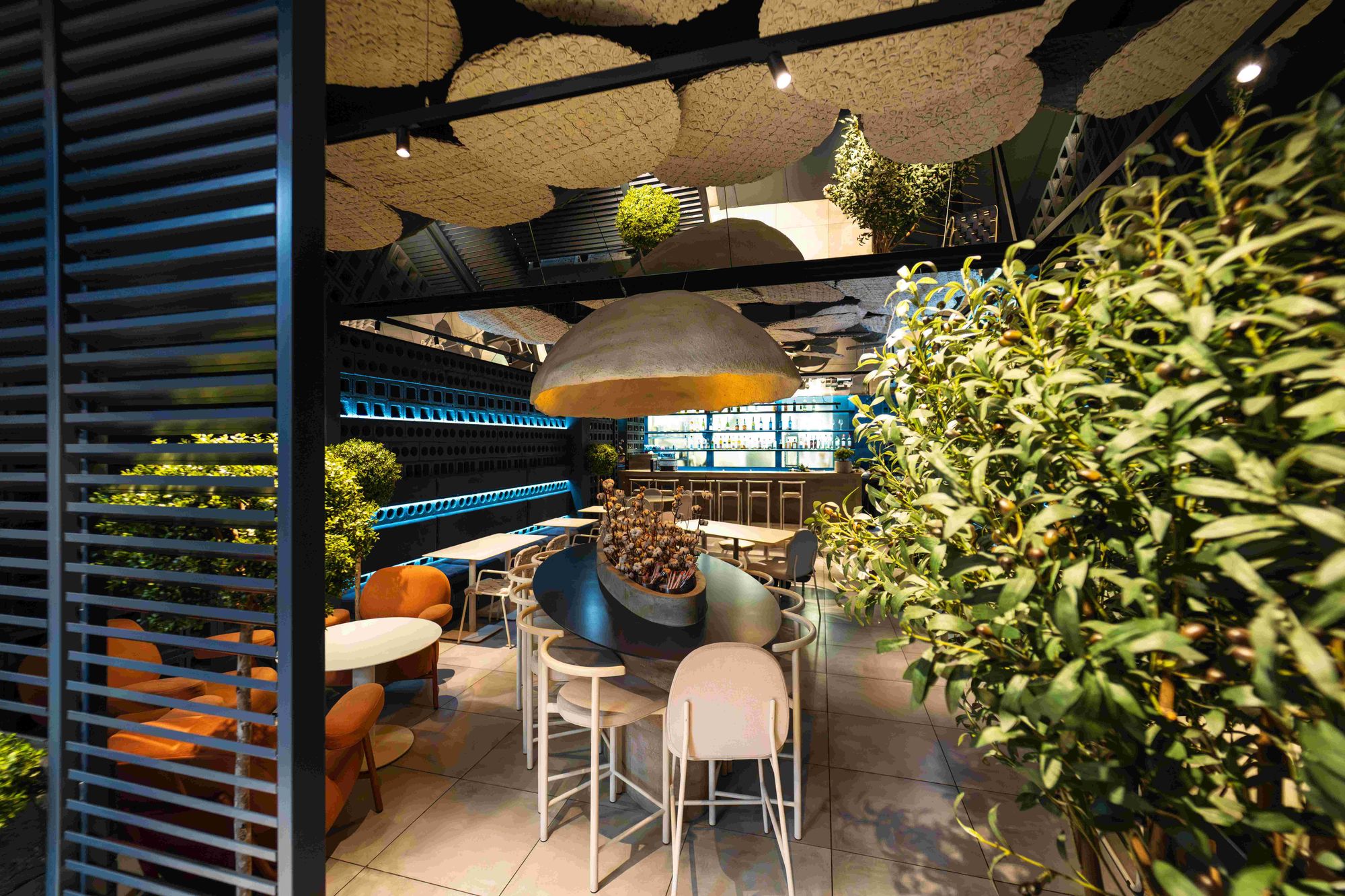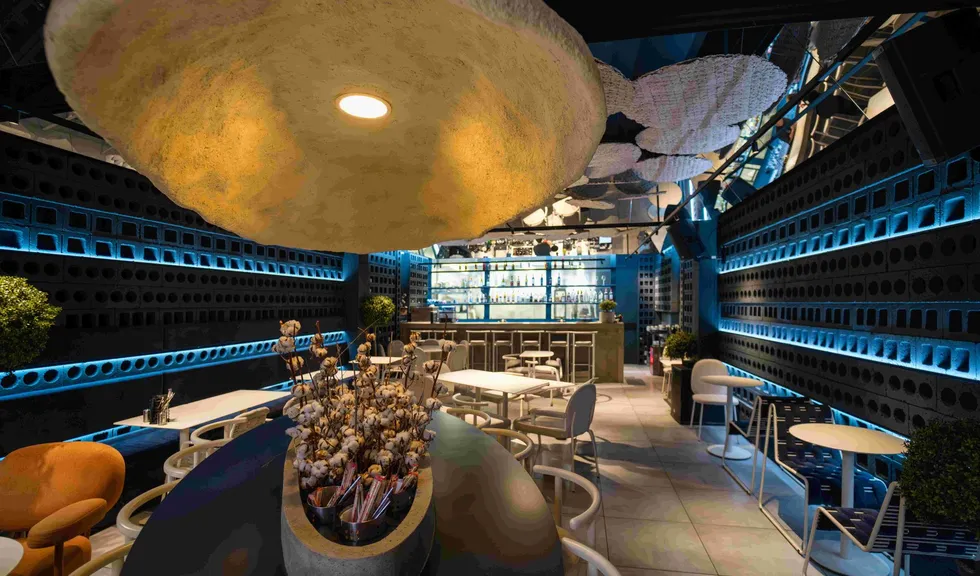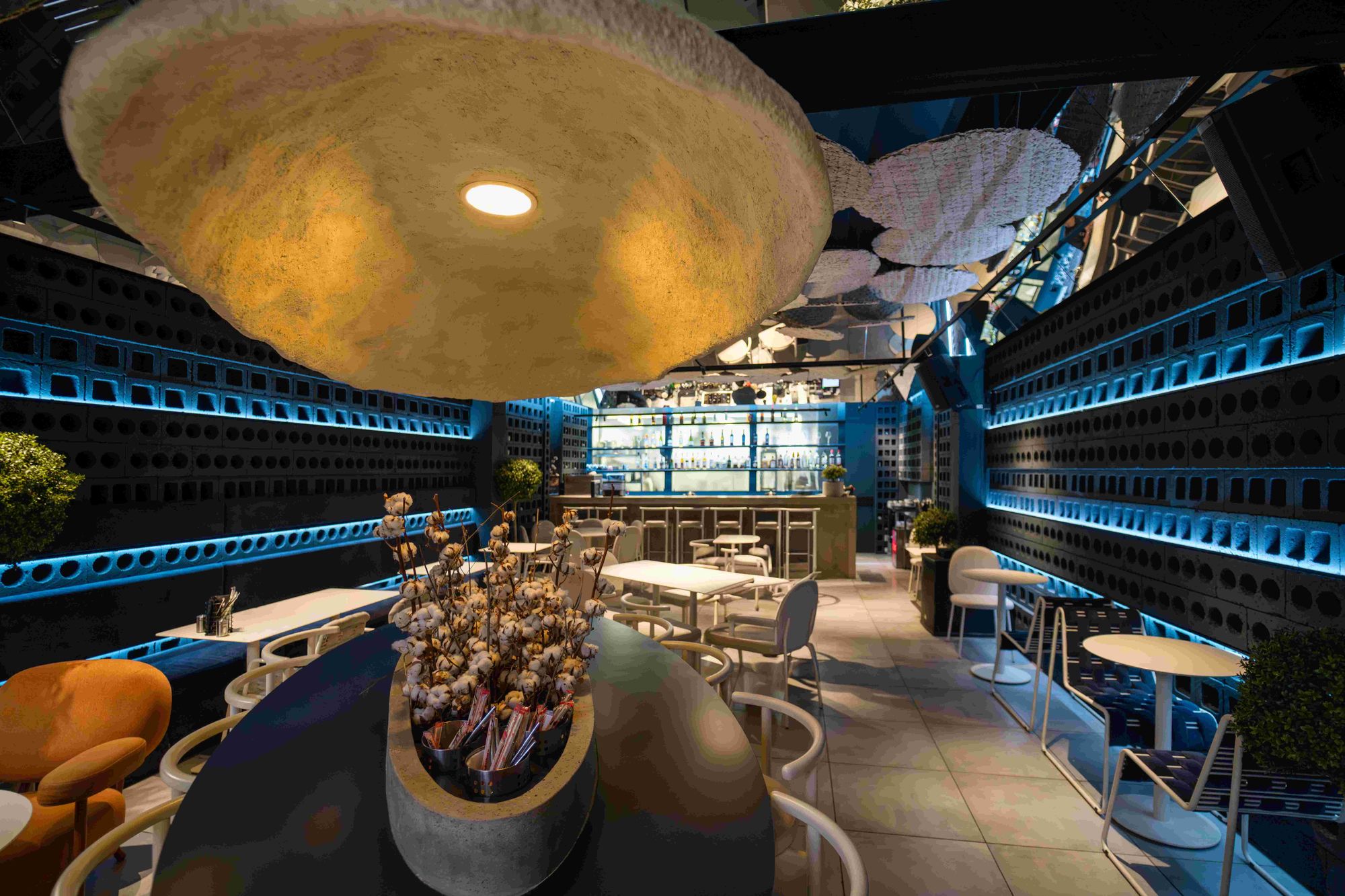 Помимо линейных светильников MAG DOTS, команда использовала споты MAG, даунлайты MS ATLAS и продукт серии DL-BL backlit, который обыграла с помощью объемного плафона необычной формы. Купол выполняет не только декоративную функцию, но еще помогает приглушить звуки и создать акустический комфорт в ресторане.