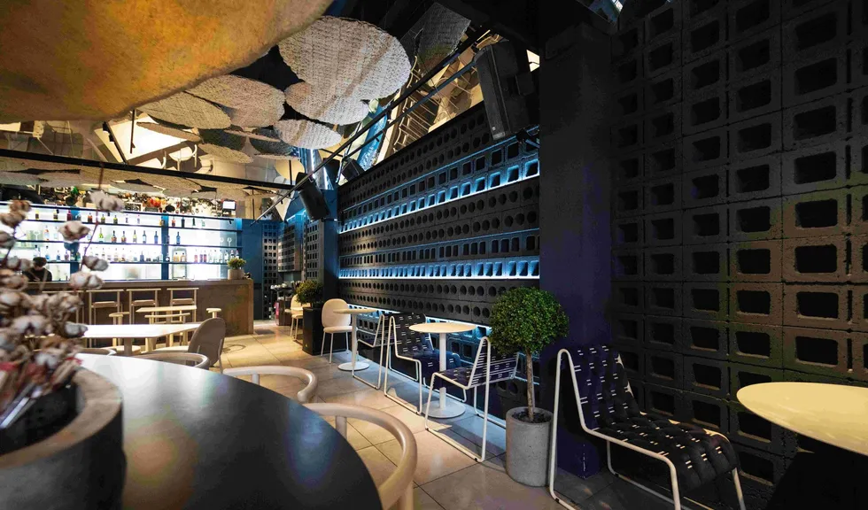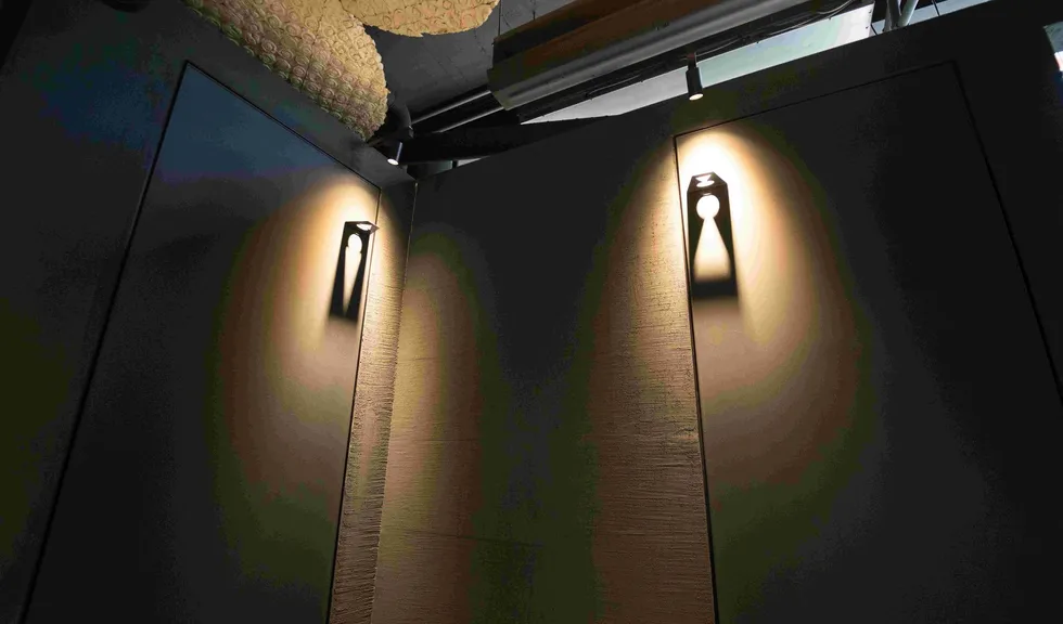 Нашлось место и для других креативных решений. Так, дизайнеры подсветили инсталляцию из… прессованных яичных сот на потолке. А символы, обозначающие санузел, выделяет игра света и тени.
