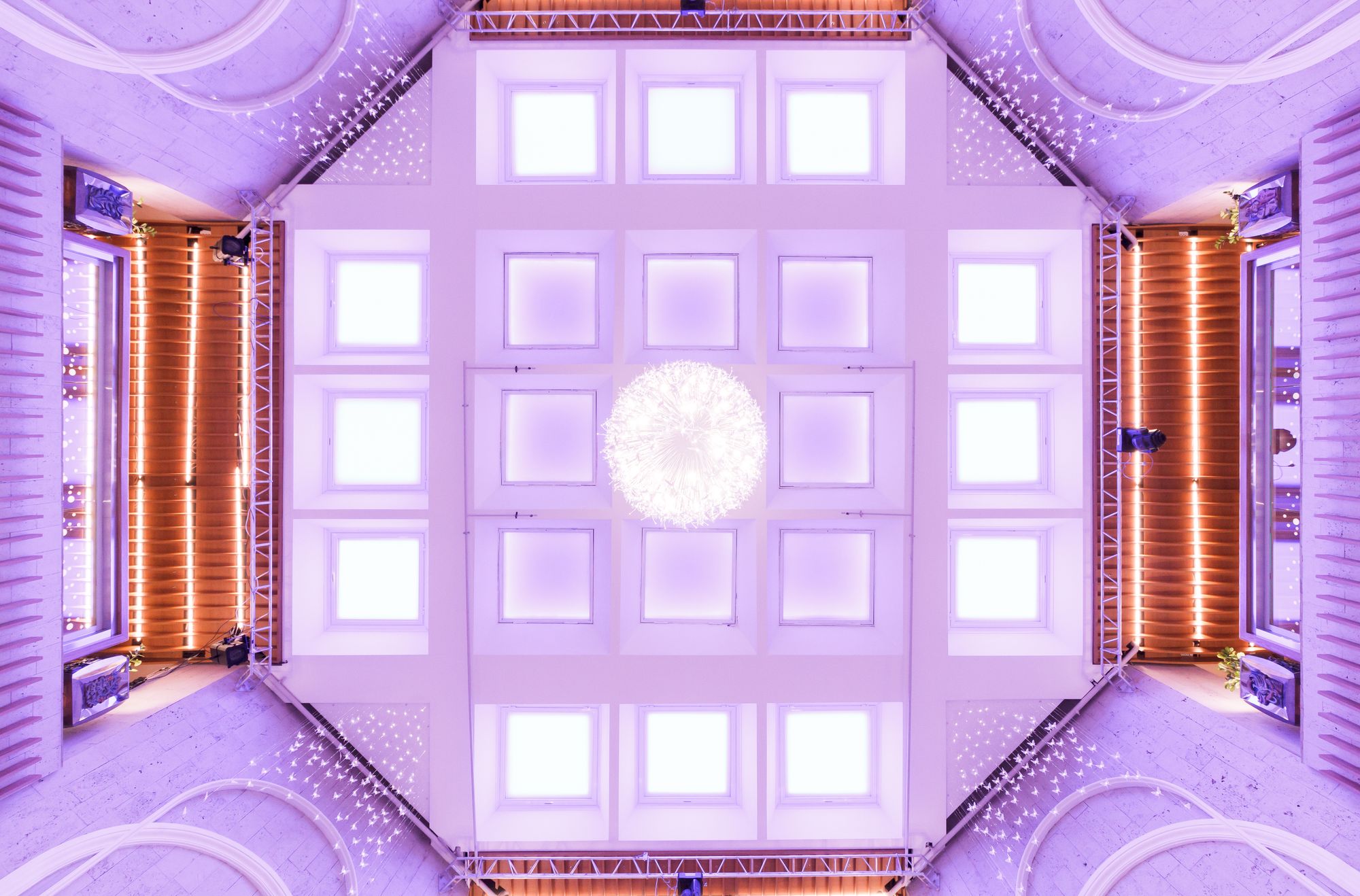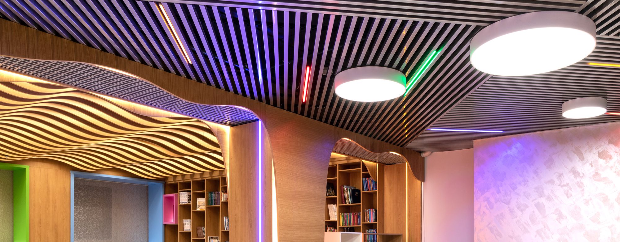 В этом красивом и масштабном проекте использовано максимальное количество светодиодной ленты различных цветов свечения. Библиотека похожа на сказочное царство света, где герои книг способны оживать в воображении читателей. При всей яркости и красочности проекта основным цветом свечения является классический белый с высоким индексом цветопередачи, который не вызывает переутомления глаз во время чтения книг. Для смены цвета свечения лент используются сенсорные пульты управления. Под потолком разместились большие квадратные светильники, напоминающие мансардные окна. Во многих залах библиотеки сделан реечный потолок с эффектом волн и встроенными световыми линиями. Интересное сочетание одноцветных и многоцветных лент, прямых световых линий и круглых потолочных светильников создает в помещении удивительную атмосферу.