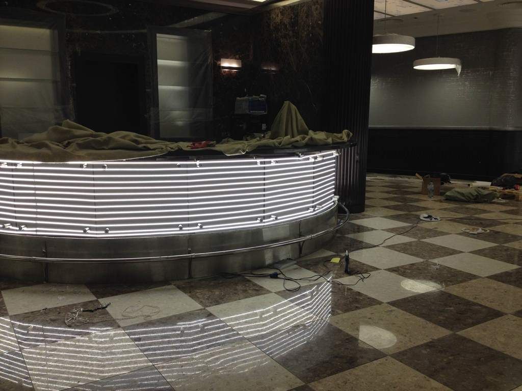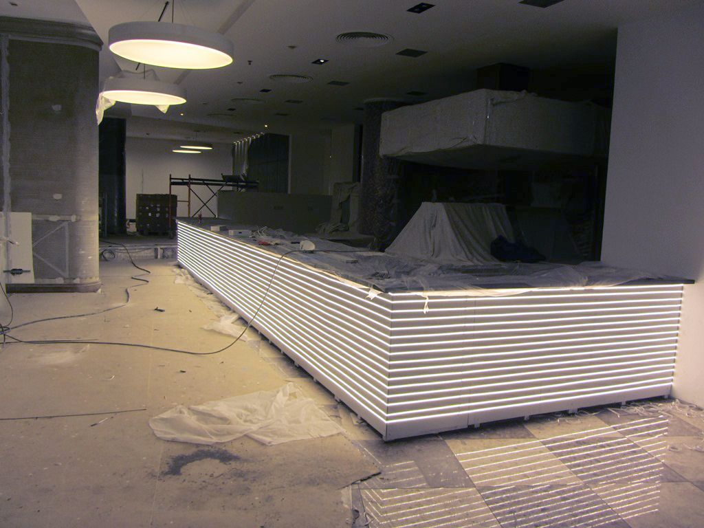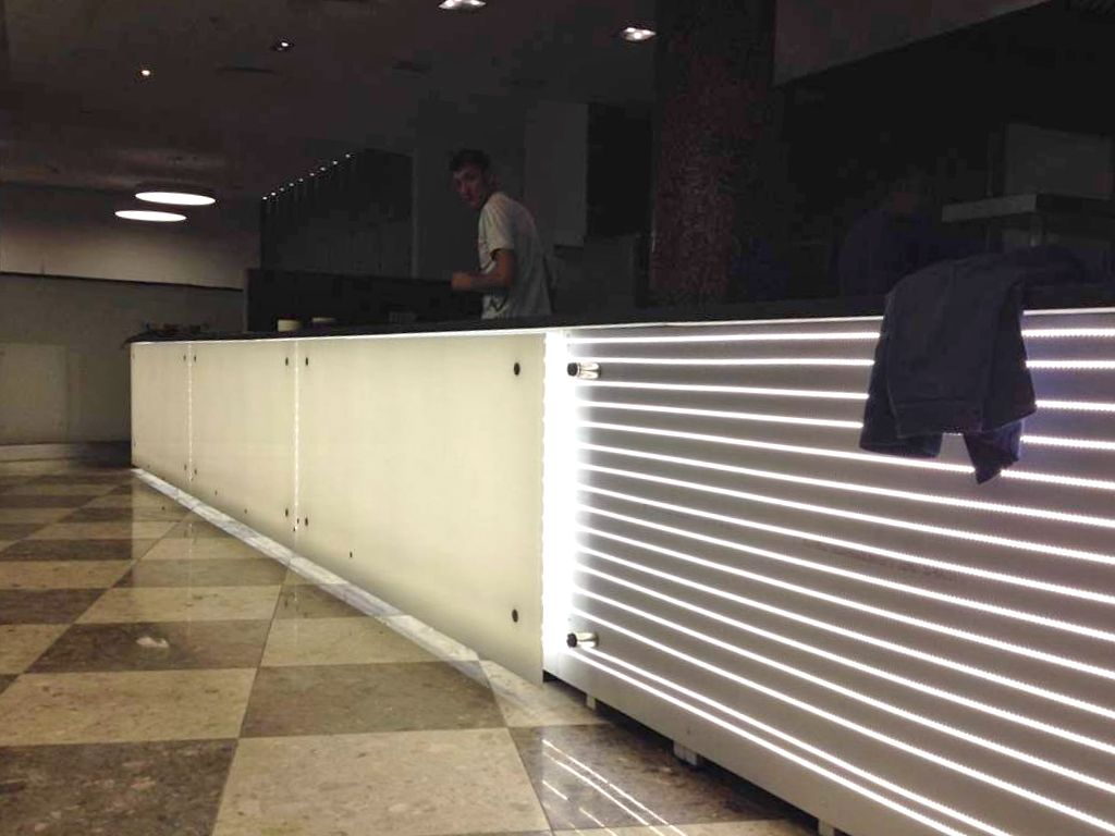 Для подсветки первой барной стойки использовалась светодиодная лента с тёплым белым свечением, для подсветки второй - с "чистым" белым. После монтажа светодиодных лент на барные стойки были установлены белые матовые стёкла.